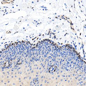 | IHC检测YAP1蛋白(货号 GB153975). 样品: 人食管, 4%多聚甲醛 (货号G1101) 固定12-24小时. 抗原修复: Tris-EDTA抗原修复液(pH 9.0) (G1203), 100℃, 25分钟. —抗: 1: 3000稀释, 4℃ 孵育过夜. 二抗: S-vision免疫组化多聚二抗(山羊抗兔),即用型 (货号G1302), 室温孵育20分钟. |