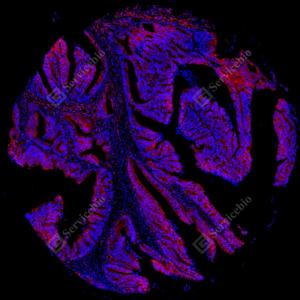 | IF检测YAP1蛋白(货号 GB153975)(红色). 样品: 人结肠癌, 4%多聚甲醛 (货号G1101) 固定12-24小时. 抗原修复: Tris-EDTA抗原修复液(pH 9.0) (G1203), 100℃, 25分钟. 封闭: 3% BSA(货号GC305010)的PBS溶液, 室温孵育30分钟. —抗: 1: 10000稀释, 4℃ 孵育过夜. 二抗: Cy3标记山羊抗兔IgG (H+L) (货号GB21303), 1: 300稀释, 室温孵育1小时. |