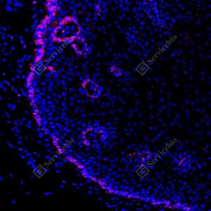| IF检测YAP1蛋白(货号 GB153975)(红色). 样品: 人食管, 4%多聚甲醛 (货号G1101) 固定12-24小时. 抗原修复: Tris-EDTA抗原修复液(pH 9.0) (G1203), 100℃, 25分钟. 封闭: 3% BSA(货号GC305010)的PBS溶液, 室温孵育30分钟. —抗: 1: 10000稀释, 4℃ 孵育过夜. 二抗: Cy3标记山羊抗兔IgG (H+L) (货号GB21303), 1: 300稀释, 室温孵育1小时. |