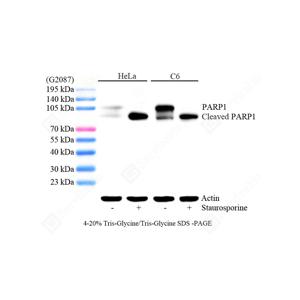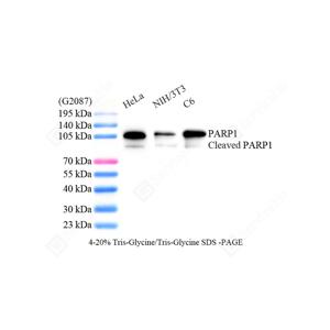 PARP1 (poly(ADP-ribose) polymerase 1) is a nuclear enzyme catalyzing the poly(ADP-ribosyl)ation of many key proteins in vivo. The normal function of PARP1 is the routine repair of DNA damage. The appearance of PARP fragments is commonly considered as an important biomarker of apoptosis.