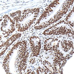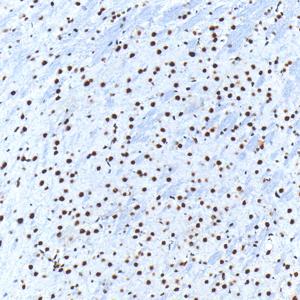 IHC检测PARP1蛋白(货号 GB15841). 样品: 人结肠, 4%多聚甲醛 (货号G1101) 固定12-24小时. 抗原修复: 柠檬酸抗原修复液(干粉, pH 6.0) (G1201), 高压锅均匀喷气计时2分钟. —抗: 1: 4000稀释, 4℃ 孵育过夜. 二抗: S-vision免疫组化多聚二抗(山羊抗兔),即用型 (货号G1302), 室温孵育20分钟. |