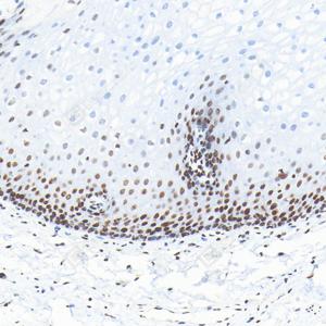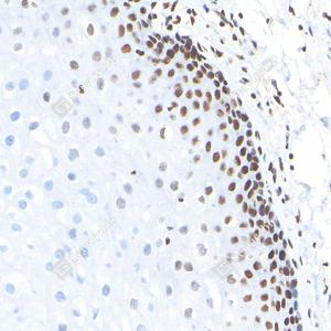 IHC检测PARP1蛋白(货号 GB15841). 样品: 人食管, 4%多聚甲醛 (货号G1101) 固定12-24小时. 抗原修复: 柠檬酸抗原修复液(干粉, pH 6.0) (G1201), 高压锅均匀喷气计时2分钟. —抗: 1: 4000稀释, 4℃ 孵育过夜. 二抗: S-vision免疫组化多聚二抗(山羊抗兔),即用型 (货号G1302), 室温孵育20分钟. |