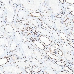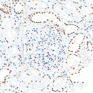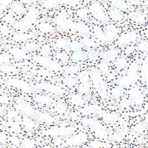 IHC检测PARP1蛋白(货号 GB15841). 样品: 人肾, 4%多聚甲醛 (货号G1101) 固定12-24小时. 抗原修复: 柠檬酸抗原修复液(干粉, pH 6.0) (G1201), 高压锅均匀喷气计时2分钟. —抗: 1: 4000稀释, 4℃ 孵育过夜. 二抗: S-vision免疫组化多聚二抗(山羊抗兔),即用型 (货号G1302), 室温孵育20分钟. |
