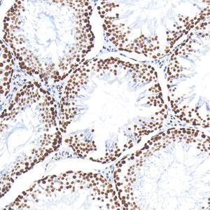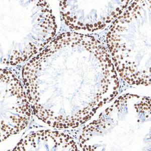 IHC检测PARP1蛋白(货号 GB15841). 样品: 大鼠睾丸, 4%多聚甲醛 (货号G1101) 固定12-24小时. 抗原修复: 柠檬酸抗原修复液(干粉, pH 6.0) (G1201), 高压锅均匀喷气计时2分钟. —抗: 1: 4000稀释, 4℃ 孵育过夜. 二抗: S-vision免疫组化多聚二抗(山羊抗兔),即用型 (货号G1302), 室温孵育20分钟. |