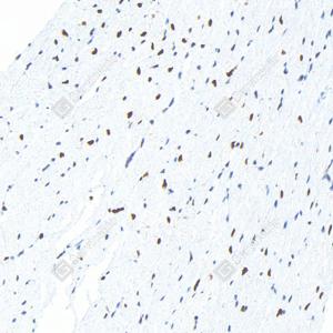 IHC检测PARP1蛋白(货号 GB15841). 样品: 小鼠心, 4%多聚甲醛 (货号G1101) 固定12-24小时. 抗原修复: 柠檬酸抗原修复液(干粉, pH 6.0) (G1201), 高压锅均匀喷气计时2分钟. —抗: 1: 4000稀释, 4℃ 孵育过夜. 二抗: S-vision免疫组化多聚二抗(山羊抗兔),即用型 (货号G1302), 室温孵育20分钟. |