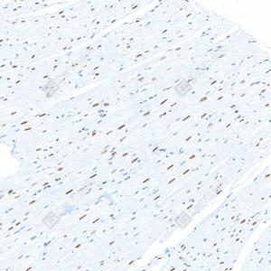 IHC检测PARP1蛋白(货号 GB15841). 样品: 大鼠心, 4%多聚甲醛 (货号G1101) 固定12-24小时. 抗原修复: 柠檬酸抗原修复液(干粉, pH 6.0) (G1201), 高压锅均匀喷气计时2分钟. —抗: 1: 4000稀释, 4℃ 孵育过夜. 二抗: S-vision免疫组化多聚二抗(山羊抗兔),即用型 (货号G1302), 室温孵育20分钟. |