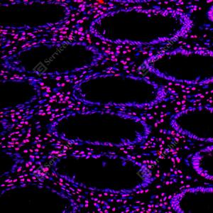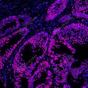 IF检测PARP1蛋白(货号 GB15841)(红色). 样品: 人结肠, 4%多聚甲醛 (货号G1101) 固定12-24小时. 抗原修复: 柠檬酸抗原修复液(干粉, pH 6.0) (G1201), 高压锅均匀喷气计时2分钟. 封闭: 3% BSA(货号GC305010)的PBS溶液, 室温孵育30分钟. —抗: 1: 2000稀释, 4℃ 孵育过夜. 二抗: Cy3标记山羊抗兔IgG (H+L) (货号GB21303), 1: 300稀释, 室温孵育1小时. |
