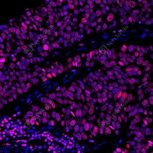 IF检测PARP1蛋白(货号 GB15841)(红色). 样品: 人食管癌, 4%多聚甲醛 (货号G1101) 固定12-24小时. 抗原修复: 柠檬酸抗原修复液(干粉, pH 6.0) (G1201), 高压锅均匀喷气计时2分钟. 封闭: 3% BSA(货号GC305010)的PBS溶液, 室温孵育30分钟. —抗: 1: 2000稀释, 4℃ 孵育过夜. 二抗: Cy3标记山羊抗兔IgG (H+L) (货号GB21303), 1: 300稀释, 室温孵育1小时. |