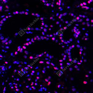 IF检测PARP1蛋白(货号 GB15841)(红色). 样品: 人肾, 4%多聚甲醛 (货号G1101) 固定12-24小时. 抗原修复: 柠檬酸抗原修复液(干粉, pH 6.0) (G1201), 高压锅均匀喷气计时2分钟. 封闭: 3% BSA(货号GC305010)的PBS溶液, 室温孵育30分钟. —抗: 1: 2000稀释, 4℃ 孵育过夜. 二抗: Cy3标记山羊抗兔IgG (H+L) (货号GB21303), 1: 300稀释, 室温孵育1小时. |