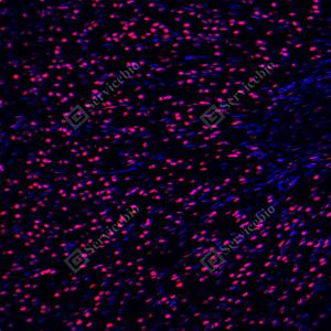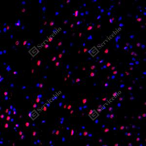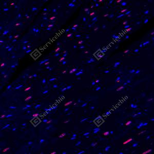 IF检测PARP1蛋白(货号 GB15841)(红色). 样品: 大鼠心, 4%多聚甲醛 (货号G1101) 固定12-24小时. 抗原修复: 柠檬酸抗原修复液(干粉, pH 6.0) (G1201), 高压锅均匀喷气计时2分钟. 封闭: 3% BSA(货号GC305010)的PBS溶液, 室温孵育30分钟. —抗: 1: 2000稀释, 4℃ 孵育过夜. 二抗: Cy3标记山羊抗兔IgG (H+L) (货号GB21303), 1: 300稀释, 室温孵育1小时. |