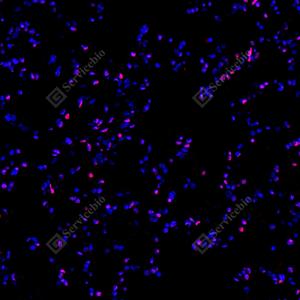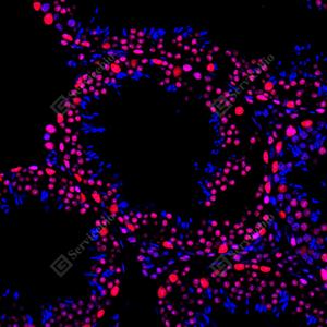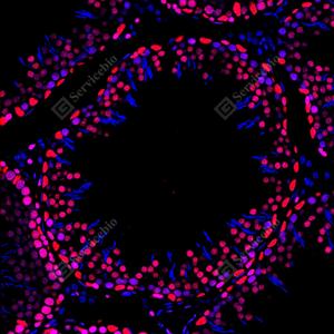 IF检测PARP1蛋白(货号 GB15841)(红色). 样品: 小鼠睾丸, 4%多聚甲醛 (货号G1101) 固定12-24小时. 抗原修复: 柠檬酸抗原修复液(干粉, pH 6.0) (G1201), 高压锅均匀喷气计时2分钟. 封闭: 3% BSA(货号GC305010)的PBS溶液, 室温孵育30分钟. —抗: 1: 2000稀释, 4℃ 孵育过夜. 二抗: Cy3标记山羊抗兔IgG (H+L) (货号GB21303), 1: 300稀释, 室温孵育1小时. |