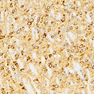 | IHC检测DRP1蛋白(货号 GB115659). 样品: 人脑, 4%多聚甲醛 (货号G1101) 固定12-24小时. 抗原修复: 柠檬酸抗原修复液(干粉, pH 6.0) (G1201), 98℃, 20分钟. —抗: 1: 300稀释, 4℃ 孵育过夜. 二抗: HRP标记山羊抗兔IgG (H+L) (货号GB23303), 1: 200稀释, 室温孵育1小时. |
