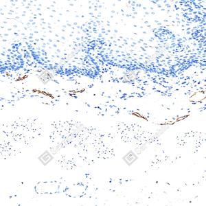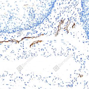 | IHC检测LYVE1蛋白(货号 GB151689). 样品: 人食管, 4%多聚甲醛 (货号G1101) 固定12-24小时. 抗原修复: Tris-EDTA抗原修复液(pH 9.0) (G1203), 100℃, 25分钟. —抗: 1: 800稀释, 4℃ 孵育过夜. 二抗: S-vision免疫组化多聚二抗(山羊抗兔),即用型 (货号G1302), 室温孵育20分钟. |