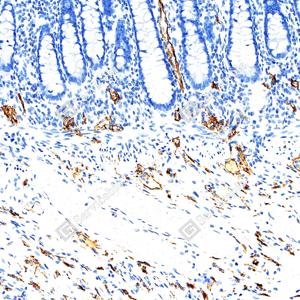 | IHC检测LYVE1蛋白(货号 GB151689). 样品: 人结肠, 4%多聚甲醛 (货号G1101) 固定12-24小时. 抗原修复: Tris-EDTA抗原修复液(pH 9.0) (G1203), 100℃, 25分钟. —抗: 1: 1600稀释, 4℃ 孵育过夜. 二抗: S-vision免疫组化多聚二抗(山羊抗兔),即用型 (货号G1302), 室温孵育20分钟. |