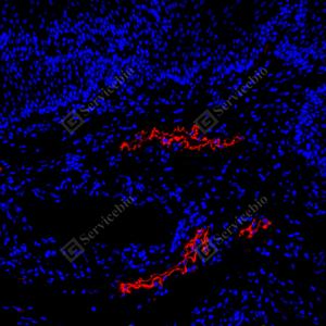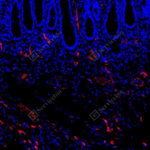 | IF检测LYVE1蛋白(货号 GB151689)(红色). 样品: 人结肠, 4%多聚甲醛 (货号G1101) 固定12-24小时. 抗原修复: Tris-EDTA抗原修复液(pH 9.0) (G1203), 100℃, 25分钟. 封闭: 3% BSA(货号GC305010)的PBS溶液, 室温孵育30分钟. —抗: 1: 800稀释, 4℃ 孵育过夜. 二抗: Cy3标记山羊抗兔IgG (H+L) (货号GB21303), 1: 300稀释, 室温孵育1小时. |