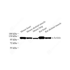WB检测Sarcomeric Alpha Actinin蛋白(货号 GB11555). 样品: 经RIPA裂解液(货号G2002)处理的蛋白质. 封闭: 3%脱脂牛奶(货号GC310001)溶于TBST溶液, 室温孵育1小时. —抗: 1: 1000稀释, 4℃ 孵育过夜. 二抗: HRP标记山羊抗兔IgG (H+L) (货号GB23303), 1: 5000稀释, 室温孵育1小时. |