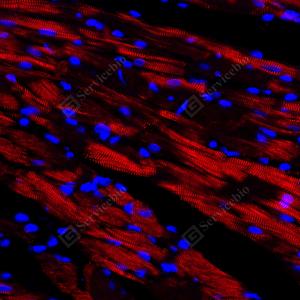 IF检测Sarcomeric Alpha Actinin蛋白(货号 GB11555)(红色). 样品: 大鼠心, 4%多聚甲醛 (货号G1101) 固定12-24小时. 抗原修复: Tris-EDTA抗原修复液 (pH 9.0) (G1203), 98℃, 20分钟. 封闭: 3% BSA(货号GC305010)的PBS溶液, 室温孵育30分钟. —抗: 1: 500, 4℃ 孵育过夜. 二抗: Cy3标记山羊抗兔IgG (H+L) (货号GB21303), 1: 300稀释, 室温孵育1小时. |