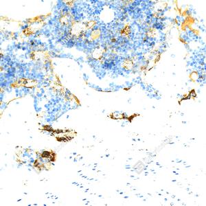 | IHC检测Tartrate Resistant Acid Phosphatase蛋白(货号 GB15416). 样品: 大鼠骨, 4%多聚甲醛 (货号G1101) 固定12-24小时. 抗原修复: Tris-EDTA抗原修复液(pH 9.0) (G1203), 98℃, 20分钟. —抗: 1: 1000稀释, 4℃ 孵育过夜. 二抗: S-vision免疫组化多聚二抗(山羊抗小鼠), 即用型(货号G1301), 室温孵育20分钟. |
