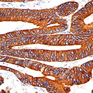| IHC检测Cytokeratin 18蛋白(货号 GB150036). 样品: 人结肠癌, 4%多聚甲醛 (货号G1101) 固定12-24小时. 抗原修复: 柠檬酸抗原修复液(干粉, pH 6.0) (G1201), 高压锅均匀喷气计时2分钟. —抗: 1: 1000稀释, 4℃ 孵育过夜. 二抗: S-vision免疫组化多聚二抗(山羊抗兔),即用型 (货号G1302), 室温孵育20分钟. |