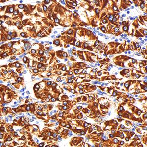 | IHC检测Cytokeratin 18蛋白(货号 GB150036). 样品: 人肾癌, 4%多聚甲醛 (货号G1101) 固定12-24小时. 抗原修复: 柠檬酸抗原修复液(干粉, pH 6.0) (G1201), 高压锅均匀喷气计时2分钟. —抗: 1: 1000稀释, 4℃ 孵育过夜. 二抗: S-vision免疫组化多聚二抗(山羊抗兔),即用型 (货号G1302), 室温孵育20分钟. |