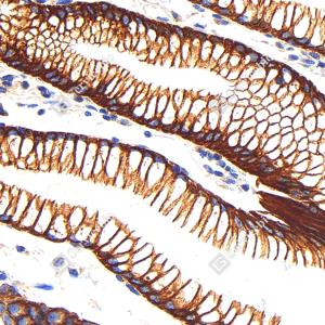 | IHC检测Cytokeratin 18蛋白(货号 GB150036). 样品: 人胃, 4%多聚甲醛 (货号G1101) 固定12-24小时. 抗原修复: 柠檬酸抗原修复液(干粉, pH 6.0) (G1201), 高压锅均匀喷气计时2分钟. —抗: 1: 1000稀释, 4℃ 孵育过夜. 二抗: S-vision免疫组化多聚二抗(山羊抗兔),即用型 (货号G1302), 室温孵育20分钟. |