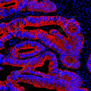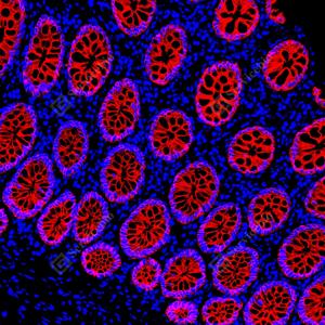 | IF检测Cytokeratin 18蛋白(货号 GB150036)(红色). 样品: 人结肠, 4%多聚甲醛 (货号G1101) 固定12-24小时. 抗原修复: 柠檬酸抗原修复液(干粉, pH 6.0) (G1201), 高压锅均匀喷气计时2分钟. 封闭: 3% BSA(货号GC305010)的PBS溶液, 室温孵育30分钟. —抗: 1: 1000稀释, 4℃ 孵育过夜. 二抗: Cy3标记山羊抗兔IgG (H+L) (货号GB21303), 1: 300稀释, 室温孵育1小时. |