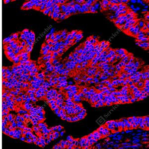 | IF检测Cytokeratin 18蛋白(货号 GB150036)(红色). 样品: 人子宫内膜癌, 4%多聚甲醛 (货号G1101) 固定12-24小时. 抗原修复: 柠檬酸抗原修复液(干粉, pH 6.0) (G1201), 高压锅均匀喷气计时2分钟. 封闭: 3% BSA(货号GC305010)的PBS溶液, 室温孵育30分钟. —抗: 1: 1000稀释, 4℃ 孵育过夜. 二抗: Cy3标记山羊抗兔IgG (H+L) (货号GB21303), 1: 300稀释, 室温孵育1小时. |