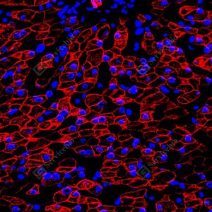 | IF检测Cytokeratin 18蛋白(货号 GB150036)(红色). 样品: 人肝, 4%多聚甲醛 (货号G1101) 固定12-24小时. 抗原修复: 柠檬酸抗原修复液(干粉, pH 6.0) (G1201), 高压锅均匀喷气计时2分钟. 封闭: 3% BSA(货号GC305010)的PBS溶液, 室温孵育30分钟. —抗: 1: 1000稀释, 4℃ 孵育过夜. 二抗: Cy3标记山羊抗兔IgG (H+L) (货号GB21303), 1: 300稀释, 室温孵育1小时. |