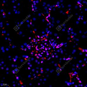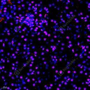 IF检测CREB蛋白(货号 GB11539)(红色). 样品: 小鼠肾, 4%多聚甲醛 (货号G1101) 固定12-24小时. 抗原修复: Tris-EDTA抗原修复液(pH 9.0) (G1203), 98℃, 20分钟. 封闭: 3% BSA(货号GC305010)的PBS溶液, 室温孵育30分钟. —抗: 1: 500稀释, 4℃ 孵育过夜. 二抗: Cy3标记山羊抗兔IgG (H+L) (货号GB21303), 1: 300稀释, 室温孵育1小时. |