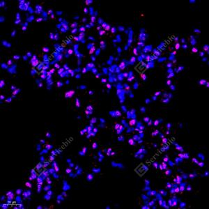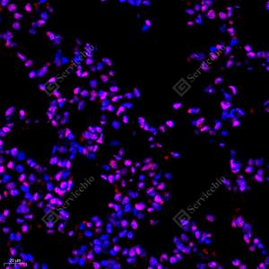 IF检测CREB蛋白(货号 GB11539)(红色). 样品: 小鼠肺, 4%多聚甲醛 (货号G1101) 固定12-24小时. 抗原修复: Tris-EDTA抗原修复液(pH 9.0) (G1203), 98℃, 20分钟. 封闭: 3% BSA(货号GC305010)的PBS溶液, 室温孵育30分钟. —抗: 1: 500稀释, 4℃ 孵育过夜. 二抗: Cy3标记山羊抗兔IgG (H+L) (货号GB21303), 1: 300稀释, 室温孵育1小时. |