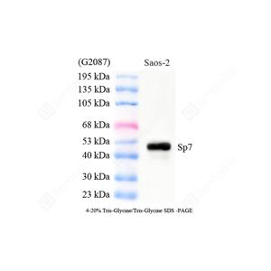 | WB检测Sp7/Osterix蛋白(货号 GB151900). 样品: 经RIPA裂解液(货号G2002)处理的蛋白质. 封闭: 3%脱脂牛奶(货号GC310001)溶于TBST溶液, 室温孵育1小时. —抗: 1: 500稀释, 4℃ 孵育过夜. 二抗: HRP标记山羊抗兔IgG (H+L) (货号GB23303), 1: 5000稀释, 室温孵育1小时. |