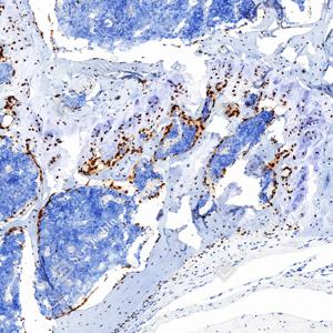 | IHC检测Sp7/Osterix蛋白(货号 GB151900). 样品: 小鼠骨髓, 4%多聚甲醛 (货号G1101) 固定12-24小时. 抗原修复: Tris-EDTA抗原修复液(pH 9.0) (G1203), 100℃, 25分钟. —抗: 1: 1500稀释, 4℃ 孵育过夜. 二抗: S-vision免疫组化多聚二抗(山羊抗兔),即用型 (货号G1302), 室温孵育20分钟. |