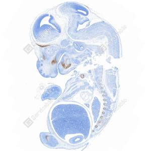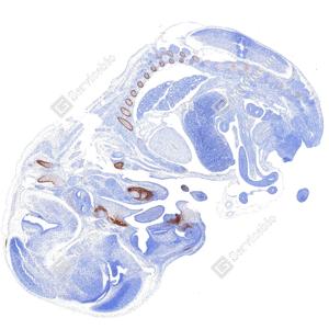 | IHC检测Sp7/Osterix蛋白(货号 GB151900). 样品: 小鼠胚胎, 4%多聚甲醛 (货号G1101) 固定12-24小时. 抗原修复: Tris-EDTA抗原修复液(pH 9.0) (G1203), 100℃, 25分钟. —抗: 1: 1500稀释, 4℃ 孵育过夜. 二抗: S-vision免疫组化多聚二抗(山羊抗兔),即用型 (货号G1302), 室温孵育20分钟. |