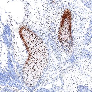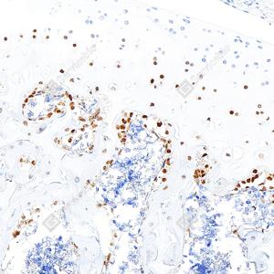 | IHC检测Sp7/Osterix蛋白(货号 GB151900). 样品: 大鼠骨髓, 4%多聚甲醛 (货号G1101) 固定12-24小时. 抗原修复: Tris-EDTA抗原修复液(pH 9.0) (G1203), 100℃, 25分钟. —抗: 1: 3000稀释, 4℃ 孵育过夜. 二抗: S-vision免疫组化多聚二抗(山羊抗兔),即用型 (货号G1302), 室温孵育20分钟. |