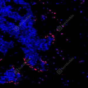 | IF检测Sp7/Osterix蛋白(货号 GB151900)(红色). 样品: 小鼠骨, 4%多聚甲醛 (货号G1101) 固定12-24小时. 抗原修复: Tris-EDTA抗原修复液(pH 9.0) (G1203), 100℃, 25分钟. 封闭: 3% BSA(货号GC305010)的PBS溶液, 室温孵育30分钟. —抗: 1: 1500稀释, 4℃ 孵育过夜. 二抗: Cy3标记山羊抗兔IgG (H+L) (货号GB21303), 1: 300稀释, 室温孵育1小时. |
