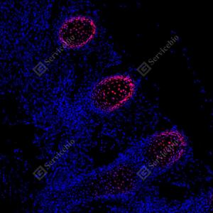 | IF检测Sp7/Osterix蛋白(货号 GB151900)(红色). 样品: 小鼠胚胎, 4%多聚甲醛 (货号G1101) 固定12-24小时. 抗原修复: Tris-EDTA抗原修复液(pH 9.0) (G1203), 100℃, 25分钟. 封闭: 3% BSA(货号GC305010)的PBS溶液, 室温孵育30分钟. —抗: 1: 1500稀释, 4℃ 孵育过夜. 二抗: Cy3标记山羊抗兔IgG (H+L) (货号GB21303), 1: 300稀释, 室温孵育1小时. |