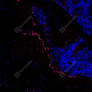 | IF检测Sp7/Osterix蛋白(货号 GB151900)(红色). 样品: 大鼠骨, 4%多聚甲醛 (货号G1101) 固定12-24小时. 抗原修复: Tris-EDTA抗原修复液(pH 9.0) (G1203), 100℃, 25分钟. 封闭: 3% BSA(货号GC305010)的PBS溶液, 室温孵育30分钟. —抗: 1: 1500稀释, 4℃ 孵育过夜. 二抗: Cy3标记山羊抗兔IgG (H+L) (货号GB21303), 1: 300稀释, 室温孵育1小时. |