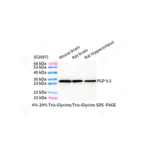 | WB检测PGP9. 5蛋白(货号 GB150181). 样品: 经RIPA裂解液(货号G2002)处理的蛋白质. 封闭: 3%脱脂牛奶(货号GC310001)溶于TBST溶液, 室温孵育1小时. —抗: 1: 1000稀释, 4℃ 孵育过夜. 二抗: HRP标记山羊抗小鼠IgG (H+L) (货号GB23301), 1: 5000稀释, 室温孵育1小时. |