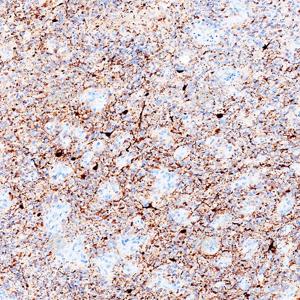 | IHC检测PGP9. 5蛋白(货号 GB150181). 样品: 人脑胶质瘤, 4%多聚甲醛 (货号G1101) 固定12-24小时. 抗原修复: 抗原修复仪(货号 ARI-4),Tris-EDTA抗原修复液(pH 9.0) (货号G1203), 水浴100℃, 25分钟. —抗: 1: 1000稀释, 4℃ 孵育过夜. 二抗: S-vision免疫组化多聚二抗(山羊抗小鼠), 即用型(货号G1301), 室温孵育20分钟. |