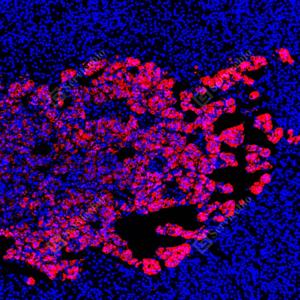 | IF检测PGP9. 5蛋白(货号 GB150181)(红色). 样品: 大鼠肾上腺, 4%多聚甲醛 (货号G1101) 固定12-24小时. 抗原修复: 抗原修复仪(货号 ARI-4),Tris-EDTA抗原修复液(pH 9.0) (货号G1203), 水浴100℃, 25分钟. 封闭: 3% BSA(货号GC305010)的PBS溶液, 室温孵育30分钟. —抗: 1: 1000稀释, 4℃ 孵育过夜. 二抗: Cy3标记山羊抗小鼠IgG (H+L) (货号GB21301), 1: 300稀释, 室温孵育1小时. |
