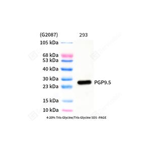 | WB检测PGP9. 5蛋白(货号 GB150176) . 样品: 经RIPA裂解液(货号G2002)处理的蛋白质. 封闭: 3%脱脂牛奶(货号GC310001)溶于TBST溶液, 室温孵育1小时. —抗: 1: 5000稀释, 4℃ 孵育过夜. 二抗: HRP标记山羊抗兔IgG (H+L) (货号GB23303), 1: 5000稀释, 室温孵育1小时. |
