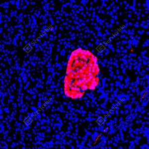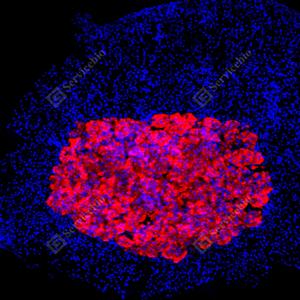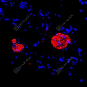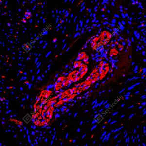 | IF检测PGP9. 5蛋白(货号 GB150176)(红色). 样品: 小鼠胰腺, 4%多聚甲醛 (货号G1101) 固定12-24小时. 抗原修复: 抗原修复仪(货号 ARI-4), Tris-EDTA抗原修复液(pH 9.0) (货号G1203), 水浴100℃, 25分钟. 封闭: 3% BSA(货号GC305010)的PBS溶液, 室温孵育30分钟. —抗: 1: 300稀释, 4℃ 孵育过夜. 二抗: Cy3标记山羊抗兔IgG (H+L) (货号GB21303), 1: 300稀释, 室温孵育1小时. |