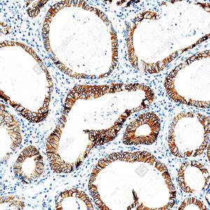 | IHC检测Sodium Potassium ATPase蛋白(货号 GB150129). 样品: 人胃癌, 4%多聚甲醛 (货号G1101) 固定12-24小时. 抗原修复: 柠檬酸抗原修复液(干粉, pH 6.0) (G1201), 高压锅均匀喷气计时2分钟. —抗: 1: 1000稀释, 4℃ 孵育过夜. 二抗: S-vision免疫组化多聚二抗(山羊抗兔),即用型 (货号G1302), 室温孵育20分钟. |
