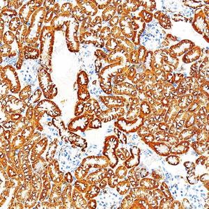 | IHC检测Sodium Potassium ATPase蛋白(货号 GB150129). 样品: 人肾, 4%多聚甲醛 (货号G1101) 固定12-24小时. 抗原修复: 柠檬酸抗原修复液(干粉, pH 6.0) (G1201), 高压锅均匀喷气计时2分钟. —抗: 1: 1000稀释, 4℃ 孵育过夜. 二抗: S-vision免疫组化多聚二抗(山羊抗兔),即用型 (货号G1302), 室温孵育20分钟. |