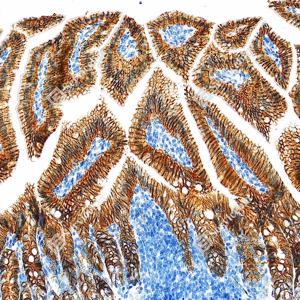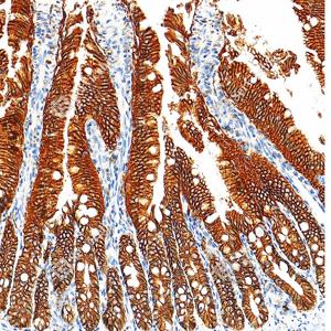 | IHC检测Sodium Potassium ATPase蛋白(货号 GB150129). 样品: 小鼠小肠, 4%多聚甲醛 (货号G1101) 固定12-24小时. 抗原修复: 柠檬酸抗原修复液(干粉, pH 6.0) (G1201), 高压锅均匀喷气计时2分钟. —抗: 1: 1000稀释, 4℃ 孵育过夜. 二抗: S-vision免疫组化多聚二抗(山羊抗兔),即用型 (货号G1302), 室温孵育20分钟. |