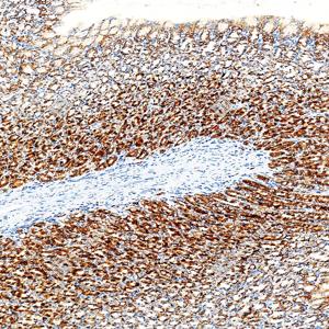 | IHC检测Sodium Potassium ATPase蛋白(货号 GB150129). 样品: 大鼠胃, 4%多聚甲醛 (货号G1101) 固定12-24小时. 抗原修复: 柠檬酸抗原修复液(干粉, pH 6.0) (G1201), 高压锅均匀喷气计时2分钟. —抗: 1: 1000稀释, 4℃ 孵育过夜. 二抗: S-vision免疫组化多聚二抗(山羊抗兔),即用型 (货号G1302), 室温孵育20分钟. |