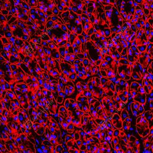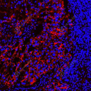 | IF检测Sodium Potassium ATPase蛋白(货号 GB150129)(红色). 样品: 人肾癌, 4%多聚甲醛 (货号G1101) 固定12-24小时. 抗原修复: 柠檬酸抗原修复液(干粉, pH 6.0) (G1201), 高压锅均匀喷气计时2分钟. 封闭: 3% BSA(货号GC305010)的PBS溶液, 室温孵育30分钟. —抗: 1: 1000稀释, 4℃ 孵育过夜. 二抗: Cy3标记山羊抗兔IgG (H+L) (货号GB21303), 1: 300稀释, 室温孵育1小时. |
