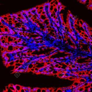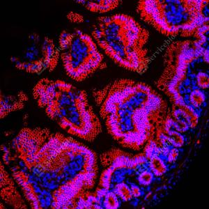 | IF检测Sodium Potassium ATPase蛋白(货号 GB150129)(红色). 样品: 小鼠小肠, 4%多聚甲醛 (货号G1101) 固定12-24小时. 抗原修复: 柠檬酸抗原修复液(干粉, pH 6.0) (G1201), 高压锅均匀喷气计时2分钟. 封闭: 3% BSA(货号GC305010)的PBS溶液, 室温孵育30分钟. —抗: 1: 1000稀释, 4℃ 孵育过夜. 二抗: Cy3标记山羊抗兔IgG (H+L) (货号GB21303), 1: 300稀释, 室温孵育1小时. |