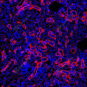 | IF检测Sodium Potassium ATPase蛋白(货号 GB150129)(红色). 样品: 小鼠肾, 4%多聚甲醛 (货号G1101) 固定12-24小时. 抗原修复: 柠檬酸抗原修复液(干粉, pH 6.0) (G1201), 高压锅均匀喷气计时2分钟. 封闭: 3% BSA(货号GC305010)的PBS溶液, 室温孵育30分钟. —抗: 1: 1000稀释, 4℃ 孵育过夜. 二抗: Cy3标记山羊抗兔IgG (H+L) (货号GB21303), 1: 300稀释, 室温孵育1小时. |