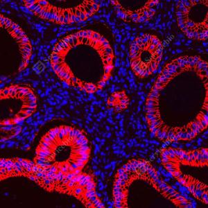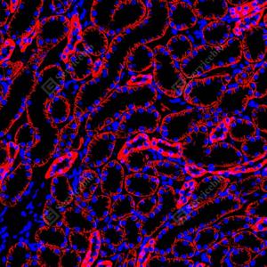 | IF检测Sodium Potassium ATPase蛋白(货号 GB150129)(红色). 样品: 小鼠结肠, 4%多聚甲醛 (货号G1101) 固定12-24小时. 抗原修复: 柠檬酸抗原修复液(干粉, pH 6.0) (G1201), 高压锅均匀喷气计时2分钟. 封闭: 3% BSA(货号GC305010)的PBS溶液, 室温孵育30分钟. —抗: 1: 1000稀释, 4℃ 孵育过夜. 二抗: Cy3标记山羊抗兔IgG (H+L) (货号GB21303), 1: 300稀释, 室温孵育1小时. |